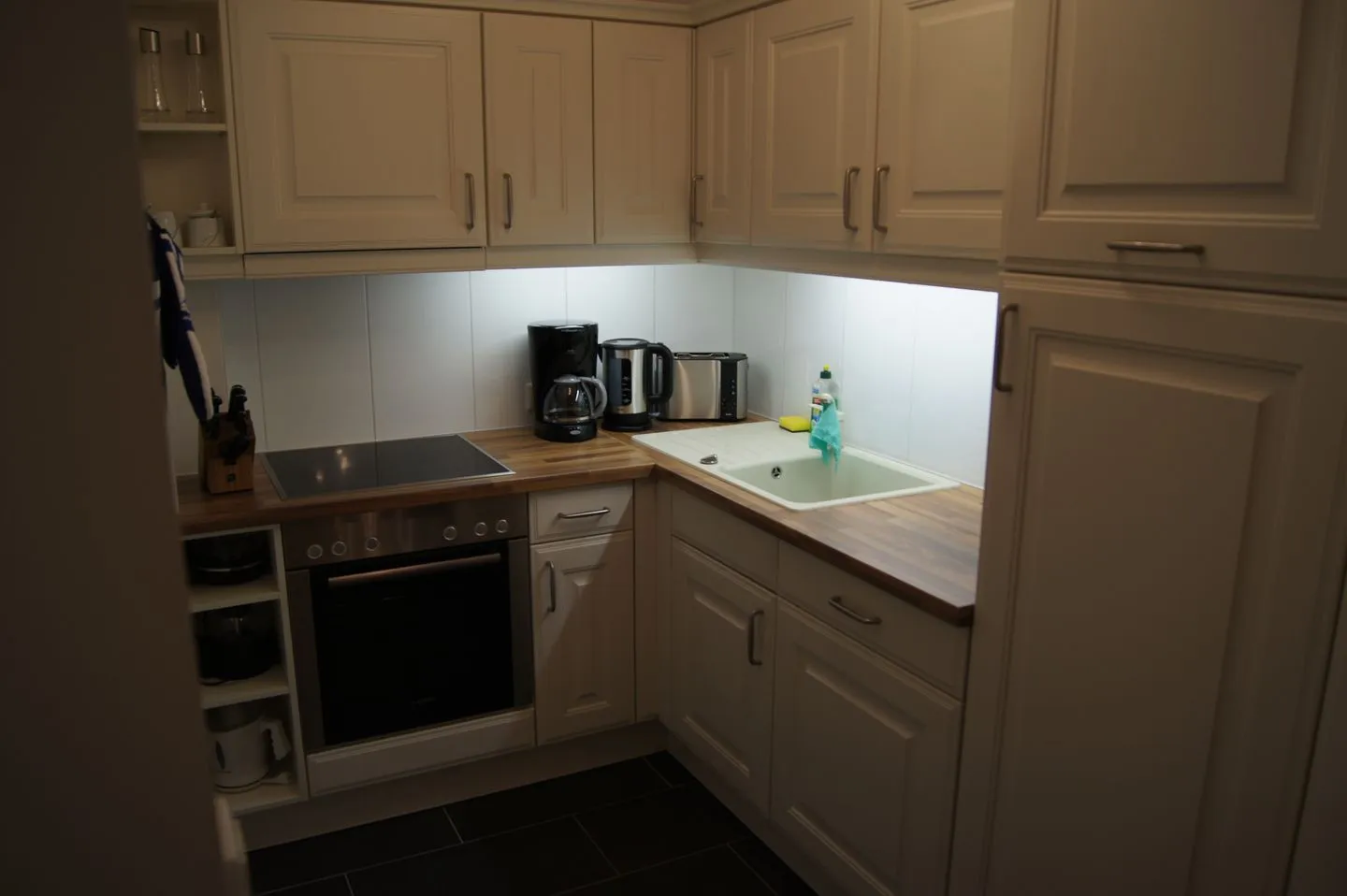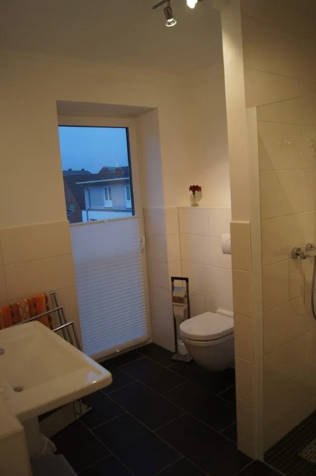 Das separate Schlafzimmer bietet ausreichend Platz und ist mit komfortabler Bettwäsche und Stauraum durch eine Kommode eingerichtet. Das Badezimmer ist modern gehalten und verfügt über eine bodengleiche Dusche, Haartrockner, Waschbecken, Spiegel sowie warmes Wasser. Frische Handtücher werden bereitgestellt. Weitere Annehmlichkeiten wie eigener Staubsauger, Ganzkörperspiegel sowie gemeinschaftlich nutzbare Waschmaschine und Trockner im Haus sorgen für zusätzliche Bequemlichkeit – die Nutzung erfolgt gemeinschaftlich und unterstützt längere Aufenthalte.